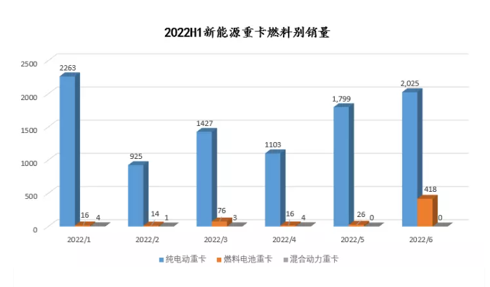 2021年全年,燃料电池车型在新能源重卡终端销量占比达到7.46%,今年1-5月,燃料电池重卡累计仅销售148辆,在前5月新能源重卡终端实销占比仅有1.93%。6月,燃料电池重卡售出418辆,同比暴涨2359%,迎来今年首次爆发。