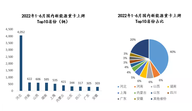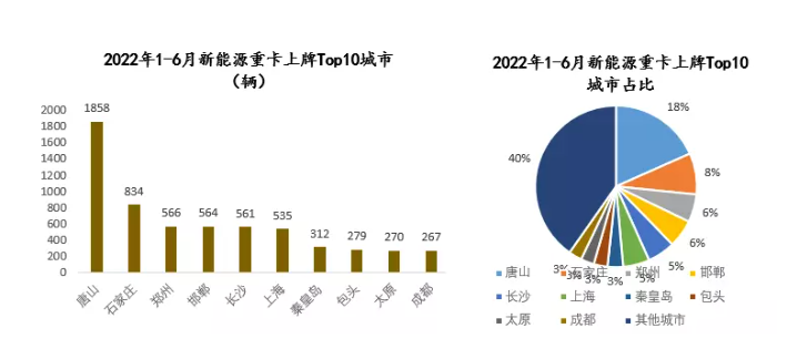 2022年上半年,各地新能源重卡销量极不均衡。Top3省份上牌占比52.2%,其中河北占比40%。从城市角度来看,前十城市合计占59.7%,前五城市合计占43.3%。上牌Top10城市中,河北省占了4个。河北、河南等地区对新能源重卡的需求较高系该地区高耗能高污染的产业结构下降碳压力所致。