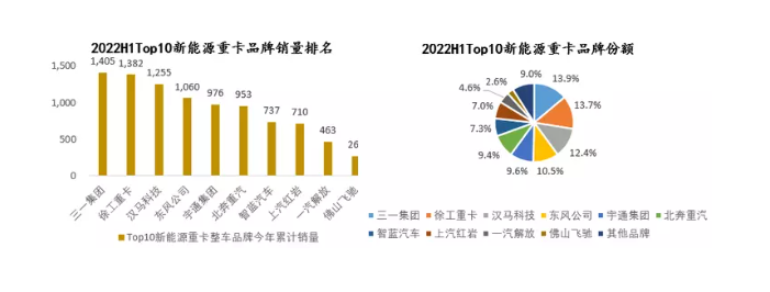 今年上半年,三一集团、徐工重卡、汉马科技,以及东风汽车的新能源重卡销量都超过了1000辆,市场较分散。