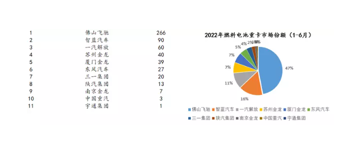 图12:2022年上半年燃料电池重卡品牌别销量及占比