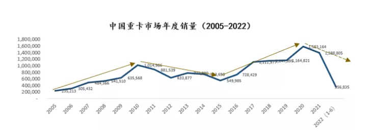十三五期间,经济高速发展→物流行业高速发展→带动整个商用车市场高速发展,重卡行业呈现高速增长趋势,2020年达到最高点。2021年下半年开始已进入一个新的下行回调周期,2022年受新冠疫情影响下行趋势更为明显。预期十四五期间,中国商用车市场整体将由增量市场向存量市场转变。