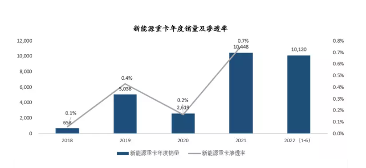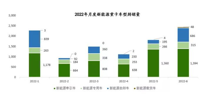 2021年新能源牵引重卡销量占比过半,进入今年牵引车仍是主力车型。2022年6月,国内新能源牵引车销售1394辆,同比增长346.8%,环比增长2.5%;上半年,新能源牵引车总计售出6042辆,同比增长558.2%。