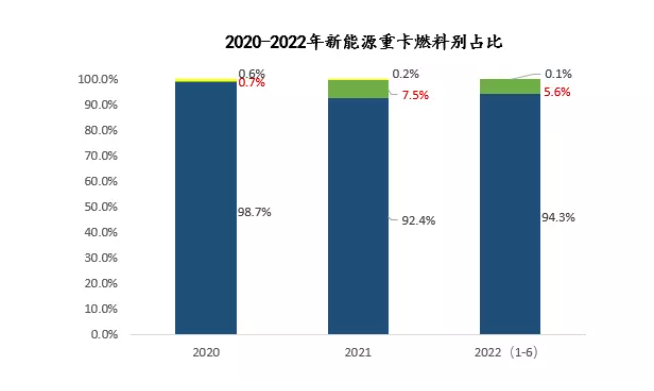从动力形式来看,2022年上半年新能源重卡技术路线仍以纯电动为主,销售9542辆,占比94.3%;燃料电池重卡累计销售566辆,占比5.6%;混合动力重卡累计销售12辆,占比0.1%。