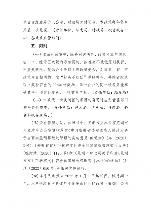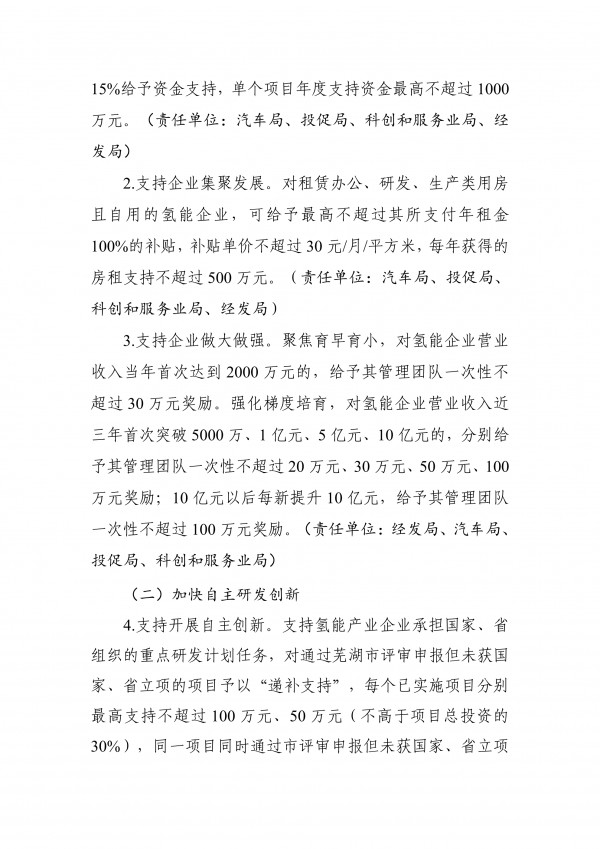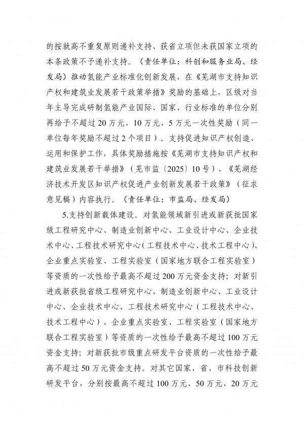4、支持开展自主创新。支持氢能产业企业承担国家、省组织的重点研发计划任务,对通过芜湖市评审申报但未获国家、省立项的项目予以“递补支持”,每个已实施项目分别最高支持不超过100万元、50万元(不高于项目总投资的30%),同一项目同时通过市评审申报但未获国家、省立项的按就高不重复原则递补支持、获省立项但未获国家立项的本条政策不予递补支持。推动氢能产业标准化创新发展,在《芜湖市支持知识产权和建筑业发展若干政策举措》奖励的基础上,区级对当年主导完成研制氢能产业国际、国家、行业标准的单位分别再给予不超过20万元、10万元、5万元一次性奖励(同一单位每年奖励不超过2个项目)。支持促进知识产权创造、运用和保护工作,具体奖励措施按《芜湖市支持知识产权和建筑业发展若干举措》(芜市监〔2025〕10号)、《芜湖经济技术开发区知识产权促进产业创新发展若干政策》(征求意见稿)内容执行。