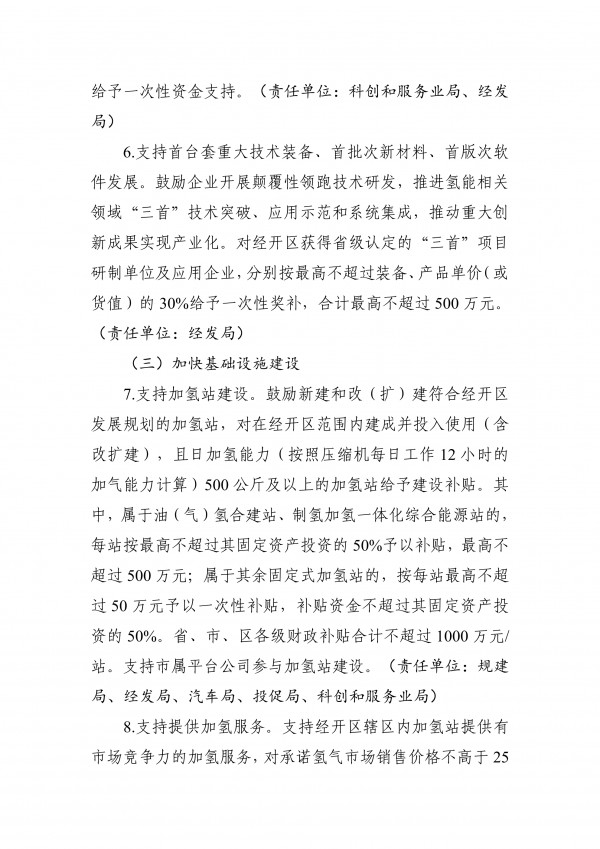 6、支持首台套重大技术装备、首批次新材料、首版次软件发展。鼓励企业开展颠覆性领跑技术研发,推进氢能相关领域“三首”技术突破、应用示范和系统集成,推动重大创新成果实现产业化。对经开区获得省级认定的“三首”项目研制单位及应用企业,分别按最高不超过装备、产品单价(或货值)的30%给予一次性奖补,合计最高不超过500万元。