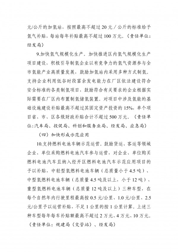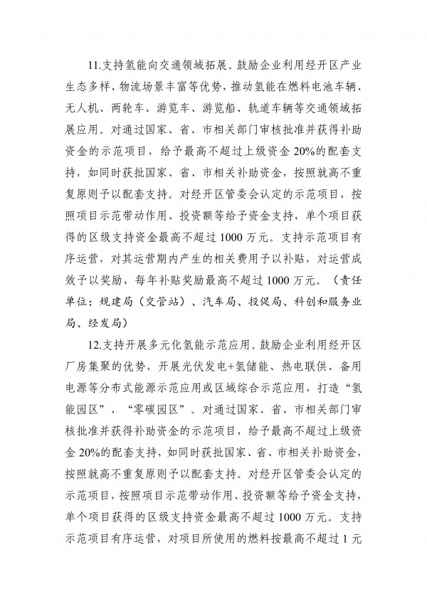 11、支持氢能向交通领域拓展。推动氢能在燃料电池车辆、无人机、两轮车、游览车、游览船、轨道车辆等交通领域拓展应用。对经开区管委会认定的示范项目,按照项目示范带动作用、投资额等给予资金支持,单个项目获得的区级支持资金最高不超过1000万元。支持示范项目有序运营,对其运营期内产生的相关费用予以补贴,对运营成效予以奖励,每年补贴奖励最高不超过1000万元。