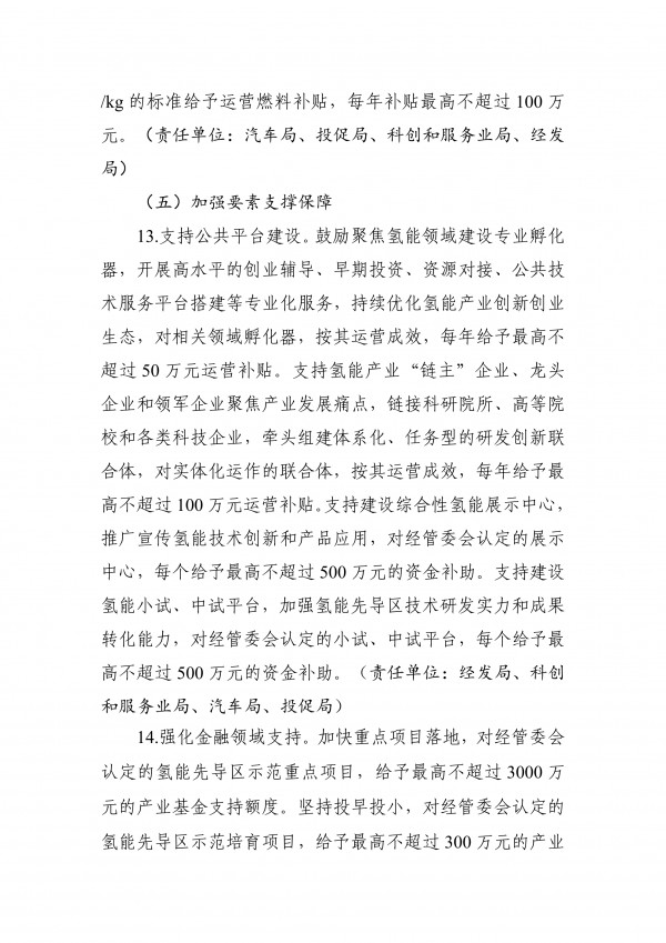 12、支持开展多元化氢能示范应用。鼓励企业利用经开区厂房集聚的优势,开展光伏发电+氢储能、热电联供、备用电源等分布式能源示范应用或区域综合示范应用,打造“氢能园区”、“零碳园区”。对经开区管委会认定的示范项目,按照项目示范带动作用、投资额等给予资金支持,单个项目获得的区级支持资金最高不超过1000万元。支持示范项目有序运营,对项目所使用的燃料按最高不超过1元/kg的标准给予运营燃料补贴,每年补贴最高不超过100万元。