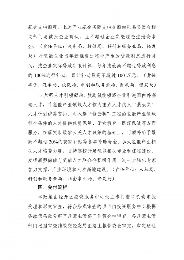 14、强化金融领域支持。加快重点项目落地,对经管委会认定的氢能先导区示范重点项目,给予最高不超过3000万元的产业基金支持额度。对氢能企业当年新融资过程中产生的贷款利息进行补助,按企业实际贷款年限计算,每年按最高不超过贷款利息的100%进行补助,累计补助最高不超过100万元。
