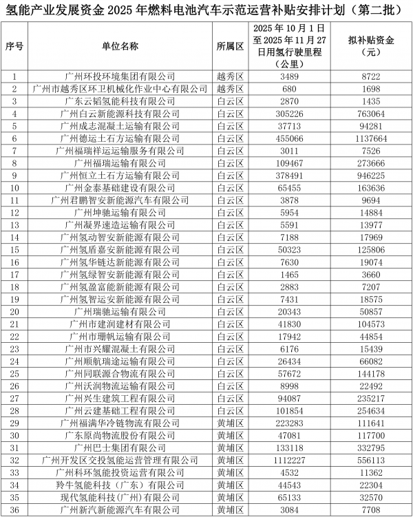 12月12日,广州市发展和改革委员会公示氢能产业发展资金2025年燃料电池汽车示范运营补贴安排计划(第二批)。