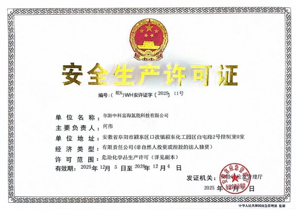 随着"双碳"目标的深入推进,氢能作为清洁能源的重要载体,其战略地位日益凸显。此次《安全生产许可证》的获批,体现了安全生产监管部门对中科富海氢能严格执行安全生产法规、持续完善安全管理体系、深入推进标准化建设以及现场装置本质安全的认可;也标志着企业液氢产品正式具备依法合规销售与经营的资质,成为企业产业化进程中的关键里程碑。中科富海始终以“自主可控、绿色高效、安全可靠”为目标,持续推进低碳能源与气体应用领域的技术创新。未来,中科富海将继续发挥技术与示范引领作用,为我国氢能产业的高质量安全发展和能源结构转型提供坚实保障。