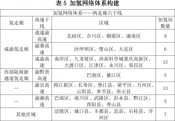 ——规划布局。以“两走廊六干线”为核心骨架(具体布局详见表5),以枢纽站点为重要支撑,构建全域覆盖、高效衔接的加氢服务网络。重点推进“两大”关键走廊建设:一是成渝氢走廊,重点覆盖成渝、渝蓉、成遂渝高速沿线;二是西部陆海新通道氢走廊,聚焦渝黔桂高速沿线布局。同时,同步推进渝湘高速、渝宜高速等重要物流通道的加氢站点建设,最终形成串联全市主要城区、重点工业园区及核心物流枢纽的干线加氢服务网络,实现加氢服务的广域覆盖与高效供给。