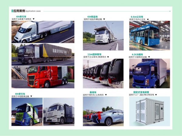 公司产品已形成“交通+能源”两大矩阵。在交通领域,公司与国内主流商用车企深度合作,先后推出了包括乘用车、重卡、物流车、轿运车、公交车以及团体客车等在内的多款氢能车型。在能源领域,公司可提供工业园区固定式燃料电池发电解决方案,实现多场景规模化应用。