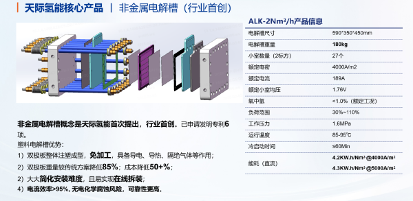 非金属电解槽概念由天际氢能首次提出,目前已申请发明专利6项,技术原创性与壁垒显著,创新设计(如整体注塑双极板、高效小室结构)从根本上解决了传统电解槽“加工难、成本高、可靠性弱”等痛点,为碱性制氢装备的升级提供了全新路径。