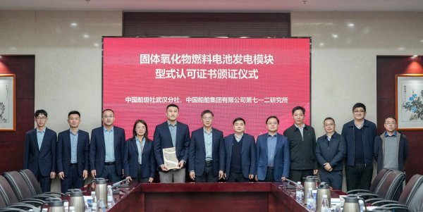 近日,国内首个固体氧化物燃料电池(SOFC)发电模块型式认可证书颁证仪式顺利举行。中国船级社(CCS)武汉分社向中船七一二所正式颁发认可证书,标志着我国船用SOFC技术实现关键突破,迈入标准化、产业化发展新阶段,为海洋领域绿色低碳转型注入强劲动力。