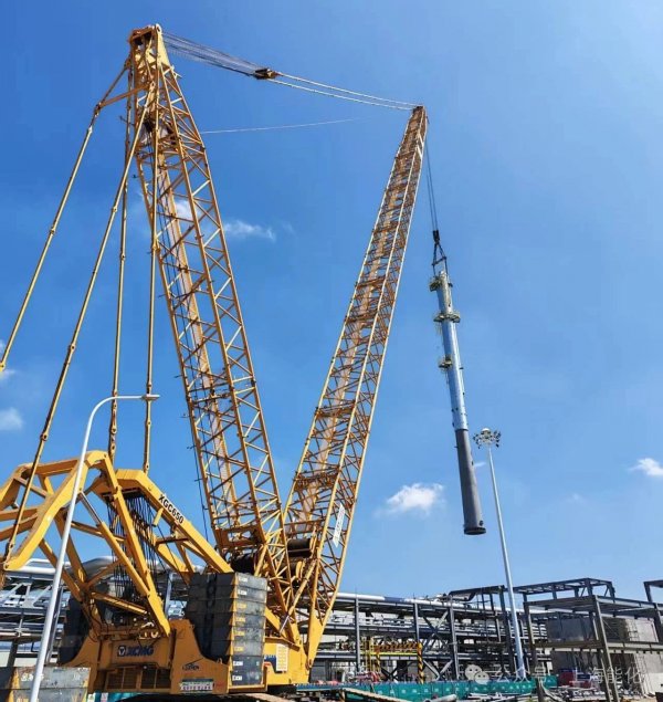 在吊装过程中,一号精馏塔采用了650吨履带吊车和一台300吨汽车溜尾吊车相互配合,于8月17日上午在现场工作人员的指挥下,顺利完成吊装。