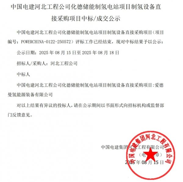 此前,在中国电建河北工程公司化德储能制氢电站项目制氢设备采购招标中,爱德曼凭借技术优势成功中标,成为该项目制氢设备供应商。项目规划建设一座装机总容量为100MW/400MWh的新型集中式储能电站,其中,氢储能部分装机容量为10MW/40MWh。爱德曼将为本项目提供3x1000Nm3/h碱性电解水制氢设备及配套技术支持。项目建成后,将有效增强区域电网调峰调频能力,提升可再生能源消纳率,为北方地区能源结构低碳转型提供重要示范。