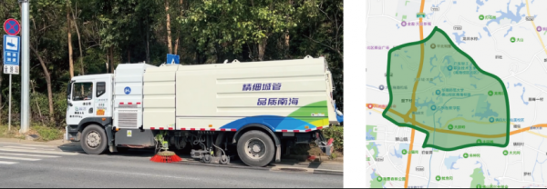 场景描述:作业车辆服务于瀚洁环境,主要在佛山市南海区四个镇街执行环卫市政服务工作。采用专车专路线作业方式,以该款18吨氢燃料电池洗扫车为例,专为佛山大学城周围路线进行单日多趟的道路清洗,单车每日运行2-3个班次,日均作业里程为80-100公里。