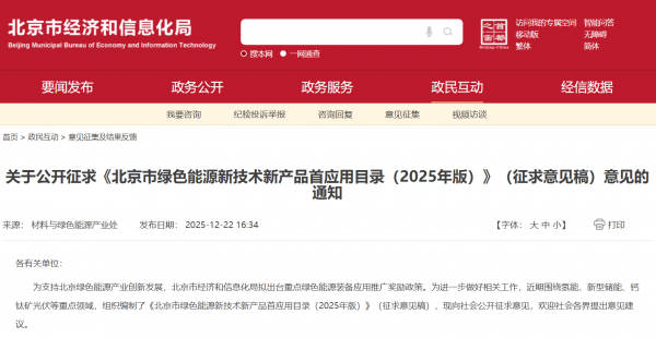 12月22日,北京市经济和信息化局公开征求《北京市绿色能源新技术新产品首应用目录(2025年版)》(征求意见稿)意见。