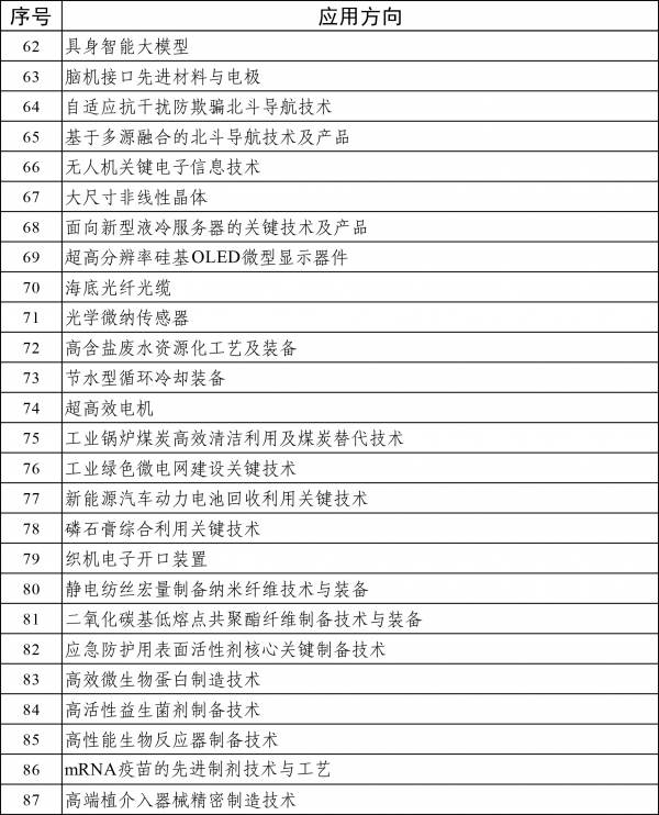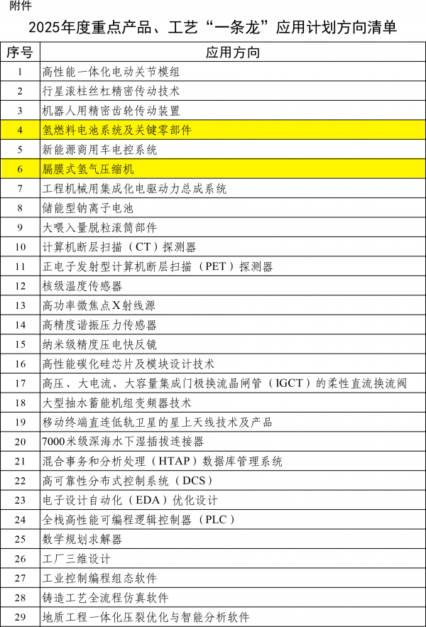 12月19日,工业和信息化部印发《2025年度重点产品、工艺“一条龙”应用计划方向》。 根据《通知》,共87个重点产品和工艺入选了“一条龙”应用计划方向(具体见附表)。而此前在9月17日,工信部规划司曾发布了《征集2025年度重点产品、工艺“一条龙”应用计划推进机构的通知》(以下简称《征集通知》),提出的目标是116个重点方向。 在氢能领域,则包括了氢燃料电池系统及关键零部件、膈膜式氢气压缩机、燃煤机组掺氨发电技术等内容。 以下为原文 工业和信息化部办公厅关于印发2025年度重点产品、工艺“一条龙”应用计划方向的通知 工信厅规函〔2025〕540号 各省、自治区、直辖市及计划单列市、新疆生产建设兵团工业和信息化主管部门: 深入贯彻党中央关于强化产业基础再造的重要部署,充分发挥应用牵引作用,加快推进优质基础产品和先进工艺推广应用,工业和信息化部组织开展2025年度重点产品、工艺“一条龙”应用计划工作。经自愿申报、专家评审、征求意见等环节,确定了2025年度重点产品、工艺“一条龙”应用计划方向,现予公布。 附件:2025年度重点产品、工艺“一条龙”应用计划方向清单 工业和信息化部办公厅 2025年12月19日