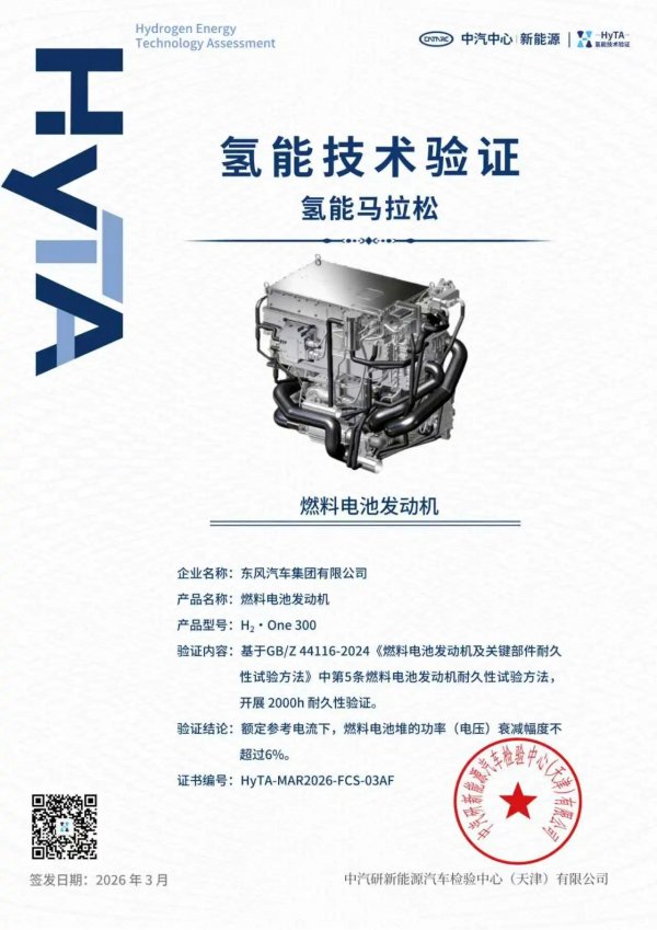 东风汽车研发总院自主研发的H?·Core 350燃料电池堆与H?·One 300燃料电池系统荣获两项HyTA权威验证证书,东风汽车成为本次验证中唯一荣获“双证书”的企业,东风氢能核心技术实力已跻身国内顶尖水平.